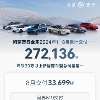 华为鸿蒙智行公布8月份交付量突破3.3万,具体数据为33,699辆,也是蝉联30万以上新能源车型总销量第一。